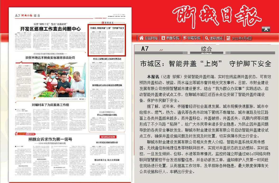 8月4日出版的第20210804期《聊城日報(bào)》在A7綜合版塊刊發(fā)文章《市城區(qū):智能井蓋“上崗” 守護(hù)腳下安全》,詳細(xì)介紹了智能井蓋的功能和優(yōu)勢。