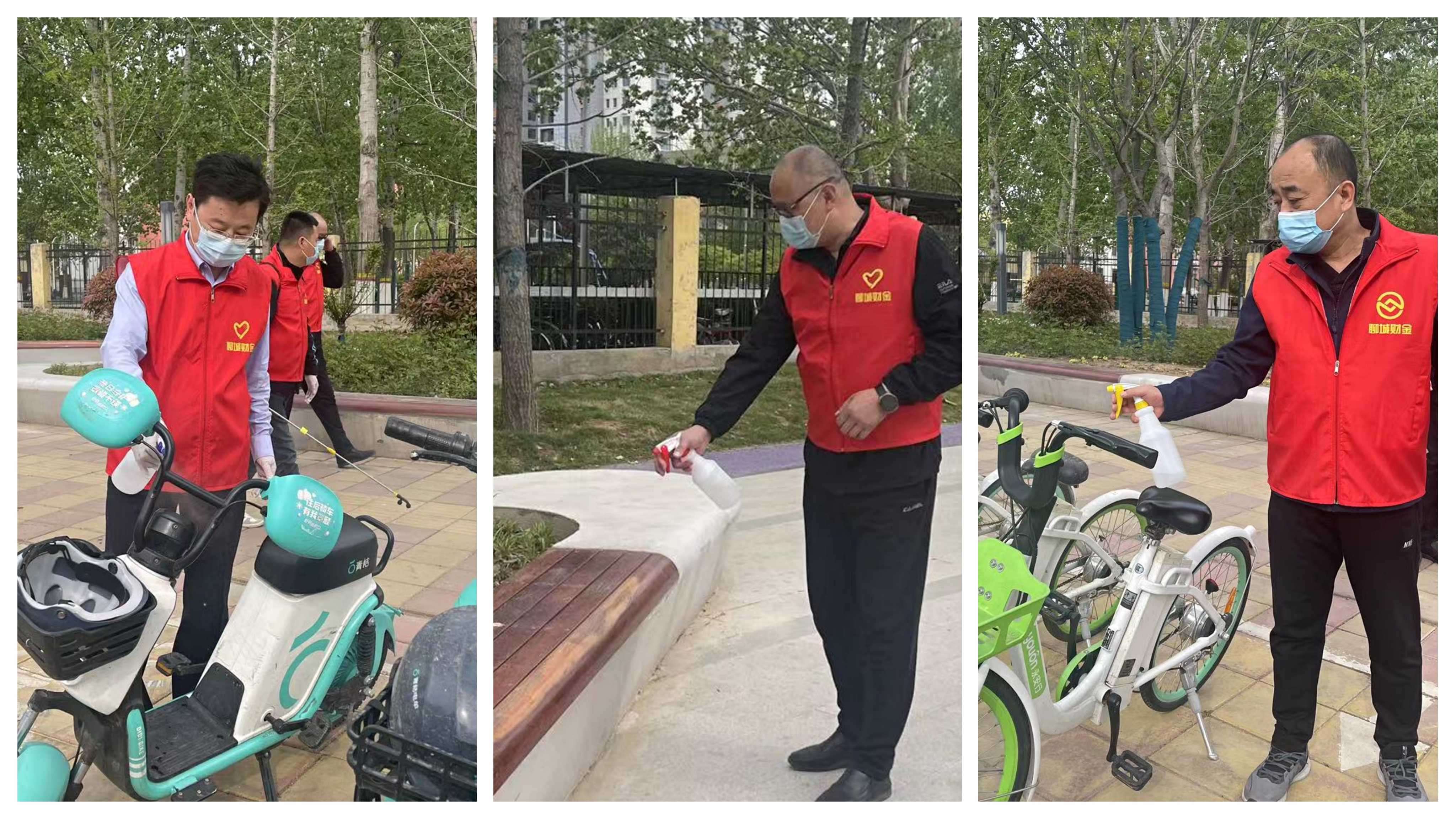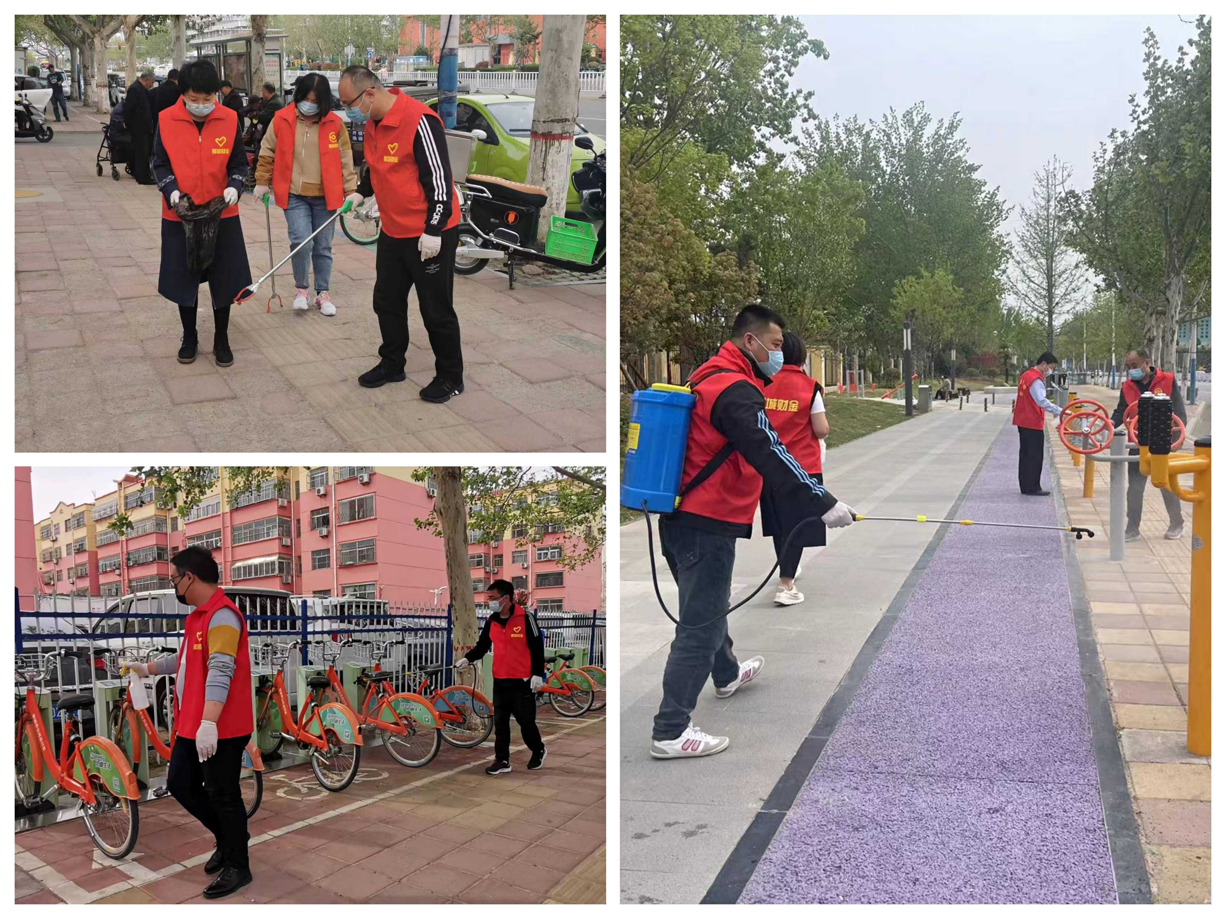 活動開展過程中,志愿者們嚴(yán)格按照防疫規(guī)定佩戴口罩、手套,做好自身防護(hù),同時(shí)對過往群眾宣講疫情防控規(guī)定,提醒佩戴口罩和遵守防疫距離,勸阻扎堆聚集行為。有的同志手持酒精噴壺對路旁健身器材、坐椅、公共自行車等公共設(shè)施進(jìn)行消毒,有的同志身背消毒水噴霧器進(jìn)行大面積路面消殺,有的同志使用工具對地面和綠化帶中垃圾進(jìn)行清理。