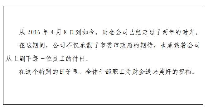 值此公司成立兩周年之際,讓我們?nèi)w干部職工不忘初心,不辱使命,團(tuán)結(jié)一致,在張董事長(zhǎng)的帶領(lǐng)下,進(jìn)一步發(fā)揚(yáng)敢于攻堅(jiān),善于克難,扎扎實(shí)實(shí),團(tuán)結(jié)能干的工作作風(fēng),為支持全市經(jīng)濟(jì)社會(huì)發(fā)展,為落實(shí)市委市政府決策部署,為全市人民的民生福祉做出我們更大的貢獻(xiàn),祝愿財(cái)金公司的明天更加輝煌。