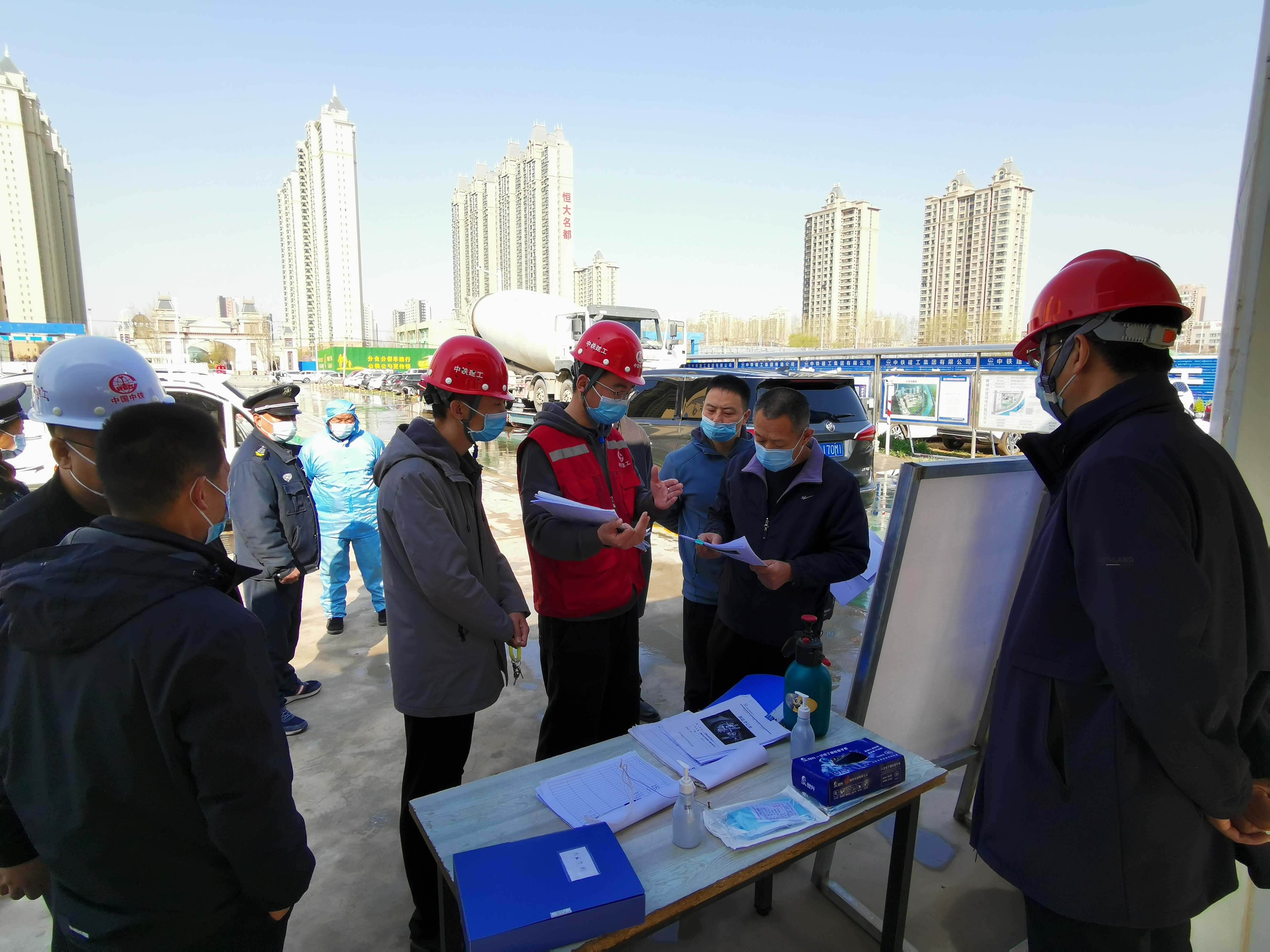 檢查組首先聽取了各項目負(fù)責(zé)人關(guān)于項目現(xiàn)場疫情防控工作的情況匯報,隨后認(rèn)真查看了外來人員和車輛進(jìn)出登記表、管理人員每日健康狀況表、場地消毒記錄等材料,檢查了防疫物資儲備情況和餐廳用餐情況。