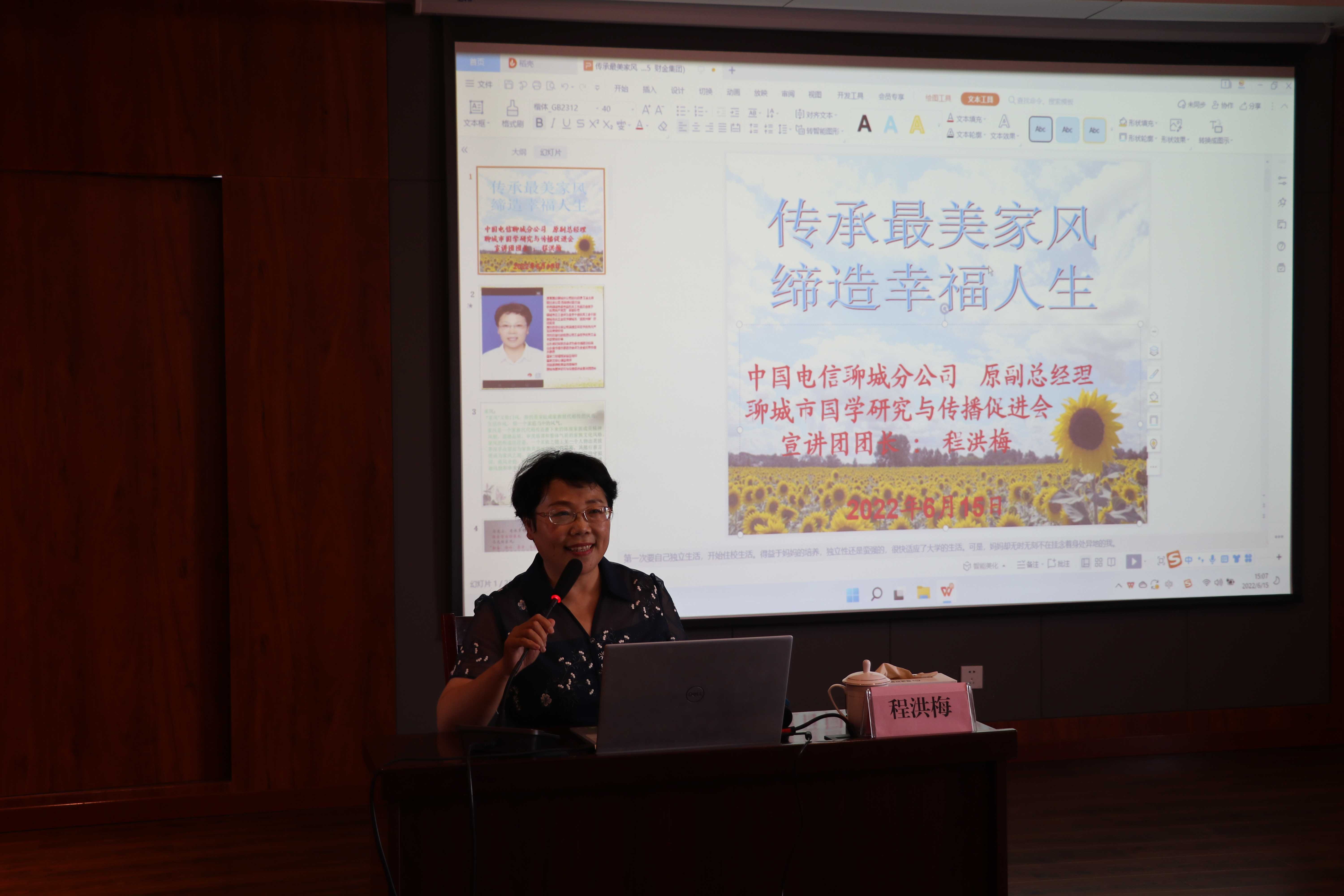 本次講座邀請聊城市國學促進會宣講團團長程洪梅講授。講座圍繞家風、家庭關(guān)系生動講授了“傳承最美家風,締造幸福人生等”內(nèi)容。通過實例分析的方式,為大家營造輕松、愉悅的氛圍。